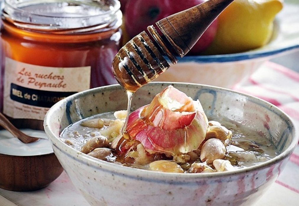 - Add a dollop of natural yoghurt, the almonds or seeds and a good drizzle of honey.